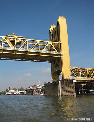 The Tower Bridge, a lift span which was built in 1935, started out painted gray but has been yellow since 1960. It originally had railroad tracks down the center for an electric railway system that ran throughout Sacramento proper. This system no longer exists but we both remember it from our childhoods. The new metallic gold paint symbolizes the Gold Rush hub that was Sacramento in 1849. The Tower Bridge, the gateway to downtown Sacramento, is our parting view as it frames the waterfront docks and the Delta King as we pass beyond. What a lovely sunny day for a departure! |