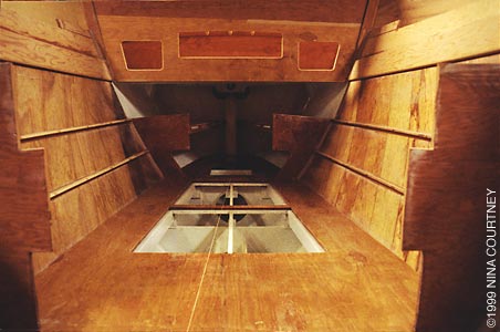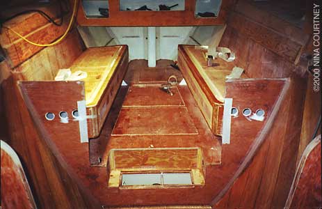 This is a shot of the settee area looking aft. The small cleats running lengthwise are there for the seats. The bilges are primed with 404/414 and the string along the sole leading through to the stern is the layout-line for the steering cable. You can just make out the internal part of the skeg way back in the stern. There are two shelves, one on either side, for storage. I've pierced the fiddles for tie-downs.