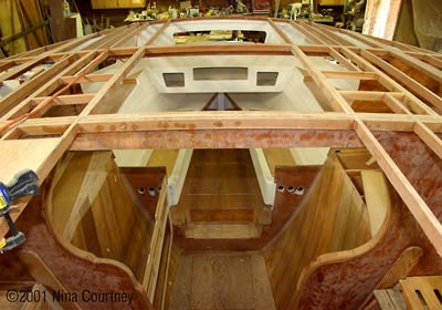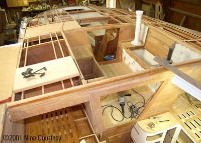 Notice I've built an access hatch into each cockpit seat. The starboard hatch opens into the engine compartment. The port bin will house the watermaker, fuel tank, and two small removable water tanks of 18 gallons each. Visible in the foreground are the berth supports in the foreward cabin, which sport a myriad of ventilation holes. |