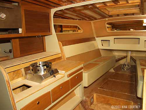 Meanwhile, the galley area is progressing. We've applied high density bulletin board cork to the cabin sides and to the hulls above the seats. Most areas have the finish paint. Drawers are in- no table yet.
