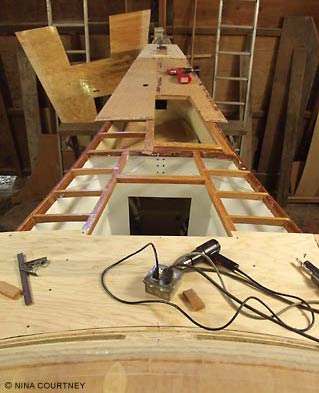I have finished the bow stringers and am getting ready to epoxy down the deck. I've primed the head area and finished all the plumbing forward of the bulkhead you see with the square cutout. There are five Y-valves and two throughulls. I used rigid PVC for venting and the pumpout. We will be able to direct the flow, so to speak, in many ways. The holding tank is a very large thirty gallons.