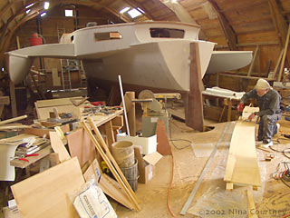 The first mate managed to get the entire boat into one shot with the wide-angle lens. I am finishing the laminations on the "forehead" piece in the right foreground. The various parts and pieces needed for the construction clutter the left-hand side. My "office" in the house looks like a marine parts store! It's all fun...